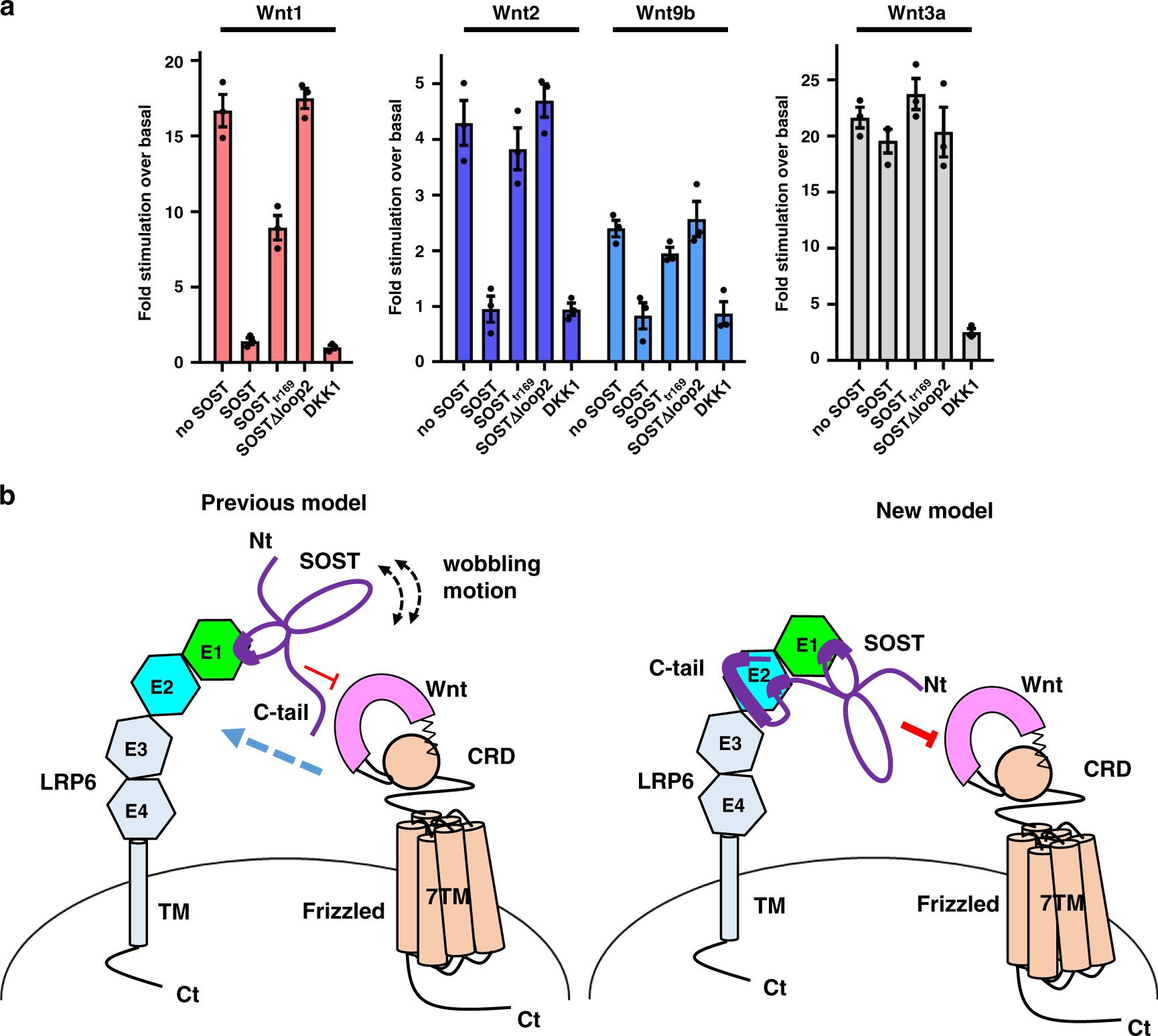 The inhibitory effects of WT SOST and SOST mutants on Wnt signaling activated by Wnt1, Wnt2, Wnt9b, and Wnt3a were measured by TopFlash assays. Full-length DKK1 was also used in the activity assays for comparison with SOST. Data from three independent experiments (nâ=â3) were analyzed and expressed as meanâ±âSEM. b A schematic model of the mechanism whereby SOST inhibits the canonical Wnt signaling pathway. In a previous model (left), only the loop 2 region of SOST was suggested to interact with the LRP6 E1 domain, which appears to inefficiently inhibit the binding of various Wnt subtypes. The double-headed arrows indicate the wobbling motion of SOST, owing to flexibility in the loop 2 region. On the other hand, the structural and functional data presented here suggest that the C-terminal HNQS region of SOST binds to LRP6 E2, and that the basic cluster region in the far C-terminus of SOST may further strengthen the interaction with the E2 domain. Based on the SOST C-tail-mediated interaction with E2, we propose a new binding model for SOST (right). In this model, tandem interaction of SOST with LRP6 E1 and E2 leads to more efficient blockage of Wnt binding.