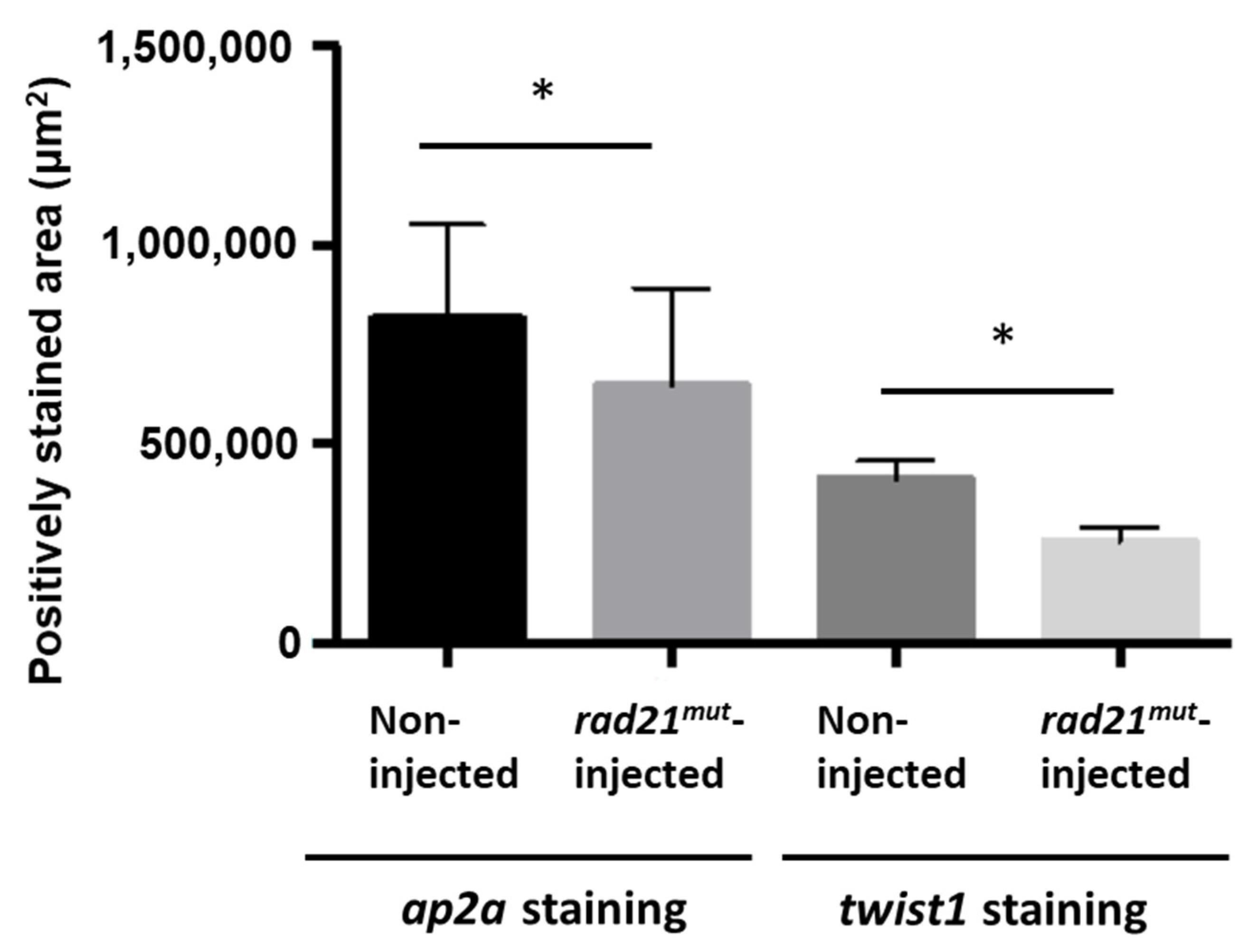 Figure 3 Cont. rad21mut disrupts the migration of neural crest cells (NCCs) in stage-25 Xenopus laevis. (a) The in situ hybridization pattern of twist1 was altered in the rad21mut-injected side. Panel i and ii show twist1 expression on both sides of the same non-injected embryo. The patterns around the optic cup (oc) and the neural crest migration streams into branchial arches (ba) are intact (indicated by a dash circle and dark solid lines, respectively). Panel iii and iv show the non-injected side and the injected side of the same rad21mut-injected embryo. The optic cup and branchial arch in panel iii are similar to those in panel i and ii, whereas these patterns are disrupted in panel iv. A total of 20 rad21mut-injected embryos were used, and 18 of them showed disrupted patterns in the rad21mut-injected side (18/20). (b) The in situ hybridization pattern of ap2a is altered in rad21mut-injected X. laevis embryos. Panel i shows ap2a is highly expressed in the head region and the spinal cord (sc) in the non-injected side. Panel ii shows the ap2a expression pattern is disrupted in the rad21mut-injected side. A total of 11 rad21mut-injected embryos were used, and 9 showed disrupted staining patterns in the rad21mut-injected side (9/11, arrowhead). Panel iii and iv show higher magnifications of the non-injected side and rad21mut-injected side of another embryo. Similar to panel ii, disrupted neural crest migration streams are shown in panel iv. A total of 11 rad21mut-injected embryos were used, and 9 showed disrupted staining patterns in the rad21mut-injected side (9/11, arrowhead). (c) Quantification of the mandibular areas showing positive staining of ap2a and twist1. Means and standard deviations for three injected sides were analyzed in each group. Statistics was done by using paired t test; * indicates p < 0.05. |