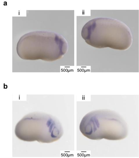 Figure 3. rad21mut disrupts the migration of neural crest cells (NCCs) in stage-25 Xenopus laevis. (a) The in situ hybridization pattern of twist1 was altered in the rad21mut-injected side. Panel i and ii show twist1 expression on both sides of the same non-injected embryo. The patterns around the optic cup (oc) and the neural crest migration streams into branchial arches (ba) are intact (indicated by a dash circle and dark solid lines, respectively). Panel iii and iv show the non-injected side and the injected side of the same rad21mut-injected embryo. The optic cup and branchial arch in panel iii are similar to those in panel i and ii, whereas these patterns are disrupted in panel iv. A total of 20 rad21mut-injected embryos were used, and 18 of them showed disrupted patterns in the rad21mut-injected side (18/20). (b) The in situ hybridization pattern of ap2a is altered in rad21mut-injected X. laevis embryos. Panel i shows ap2a is highly expressed in the head region and the spinal cord (sc) in the non-injected side. Panel ii shows the ap2a expression pattern is disrupted in the rad21mut-injected side. A total of 11 rad21mut-injected embryos were used, and 9 showed disrupted staining patterns in the rad21mut-injected side (9/11, arrowhead). Panel iii and iv show higher magnifications of the non-injected side and rad21mut-injected side of another embryo. Similar to panel ii, disrupted neural crest migration streams are shown in panel iv. A total of 11 rad21mut-injected embryos were used, and 9 showed disrupted staining patterns in the rad21mut-injected side (9/11, arrowhead). (c) Quantification of the mandibular areas showing positive staining of ap2a and twist1. Means and standard deviations for three injected sides were analyzed in each group. Statistics was done by using paired t test; * indicates p < 0.05. |