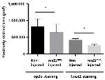 Figure 4 The expression of pitx2 was decreased by injecting rad21mut into X. laevis embryos. The transcription factor pitx2 is highly abundant in periocular mesenchymes (POM) and was used as a marker of POM. The lens is indicated by a dash circle. (a) Panel i and iii show the in situ hybridization expression pattern of pitx2 (blue) in the non-injected side of two X. laevis embryos at stage 41. The other sides of all five embryos (5/5) injected with rad21mut mRNAs showed a lack of pitx2 staining in the cornea (C) area (panel ii and iv). Normal structures of lens and retina layers could be observed in both the non-injected and the rad21mut-injected sides. (b) The quantification of pitx2-positive areas in the non-injected control eyes and the rad21mut-injected eyes was done using ImageJ. *** A significant decrease of staining corresponding to 57.7% was detected (p = 0.003). |
