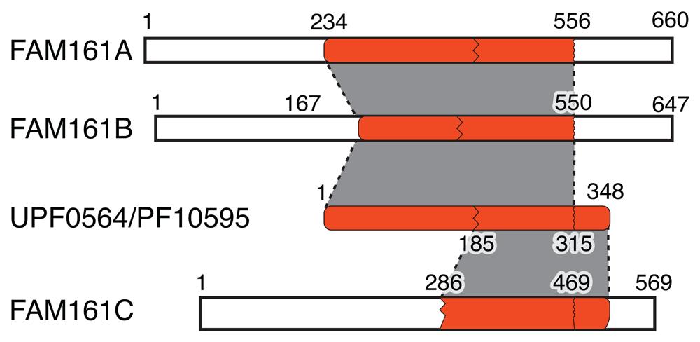 Figure 1. Alignment of human FAM161A/B/C with UPR0564/PF10595.