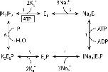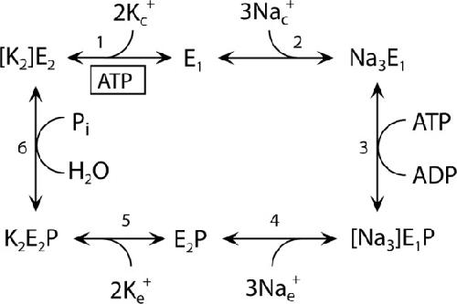 Figure 1. Na+, K+-ATPase reaction cycle. E1 and E2 represent the main conformational states of the enzyme. P indicates phosphorylated states. E1P and E2P are the respective ADP-sensitive and ADP-insensitive (K+ sensitive) phosphoenzyme intermediates2. Occluded Na+ and K+ ions3 are shown in brackets. Free ions are labelled c and e for cytoplasmic and extracellular side, respectively. Boxed ATP indicates ATP bound in a non-phosphorylating mode, enhancing the rate of K+ deocclusion, and accompanying E2-E1 conformational change2. The partial reactions of the cycle are numbered 1–6.