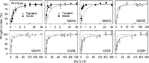 Figure 2. Na+ dependence of phosphorylation. Phosphorylation was carried out for 10 s at 0 °C with 2 μM [γ-32P]ATP in 20 mM Tris (pH 7.5), 3 mM MgCl2, 1 mM EGTA, 20 μg oligomycin/ml (to prevent dephosphorylation), ouabain to inhibit the endogenous COS-1 cell Na+, K+-ATPase (10 μM for stably expressed enzyme and 100 μM for transiently expressed enzyme), and various concentrations of NaCl (and NMG+ to maintain the same ionic strength at all NaCl concentrations). For further details, see Methods. Symbols with error bars represent mean ± s.d. Open and closed symbols represent transiently and stably expressed enzyme, respectively. Each line represents the best fit of a Hill function (Eq. 1 of Methods). Extracted K0.5 values are listed in Table 1 with statistical information. Dotted lines reproduce the corresponding wild type for direct comparison in the same panel (only the stably expressed wild type is shown in the panel with Q925A).