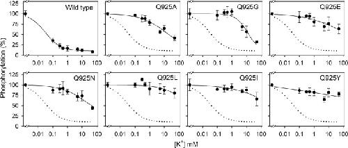 Figure 3. K+ inhibition of phosphorylation. Phosphorylation with [γ-32P]ATP was carried out for 10 s at 0 °C with 2 μM [γ-32P]ATP in 20 mM Tris (pH 7.5), 50 mM NaCl, 3 mM MgCl2, 1 mM EGTA, ouabain to inhibit the endogenous COS-1 cell Na+, K+-ATPase, and various concentrations of KCl (with choline chloride to maintain a constant ionic strength). In these experiments, oligomycin was absent to allow dephosphorylation. For further details, see Methods. Symbols with error bars represent mean ± s.d. Each line represents the best fit of Eq. 2 of Methods. Extracted IC50 values are listed in Table 1 with statistical information. Dotted lines reproduce the wild type for direct comparison in the same panel.