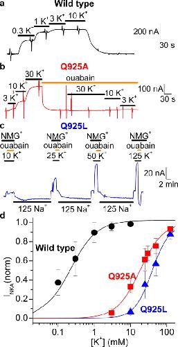 Figure 5. K+-concentration dependence of Na+, K+-ATPase currents in oocytes. (a–c) Representative current recordings at –50 mV (black, red, and blue traces). (a) Wild type-injected oocyte exposed to increasing concentrations of K+ (black lines) while bathed in NMG+ solution. K+-induced currents were fully saturated at 3 mM K+. (b) A similar experiment in an oocyte injected with Q925A. Here, much larger K+ concentrations (black lines) were required to activate Na+, K+-ATPase currents. Ouabain (10 mM, orange line) completely inhibited the K+-induced currents. (c) An oocyte injected with Q925L was exposed to 10 mM K+ (black line) followed by 10 mM ouabain (orange line), in NMG+ solution. Upon ouabain withdrawal in Na+ solution (black line) to recover from ATPase inhibition, the solution was switched to NMG+ where 25 mM K+ and subsequently ouabain were applied, uncovering Na+, K+-ATPase currents. The manoeuvres were repeated with 50 and 125 mM K+. (d) K+-concentration dependence of the current at –50 mV. Data points represent the mean ± s.d. Line plots are the Hill equations (Eq. 4. in Methods) fitted to the data from individual oocytes, with the K0.5 and statistics shown in Table 3. The global fit of the experiments used a single Hill coefficient shared among all the experiments for each mutant, with values n = 1.3 ± 0.1 for wild type, n = 1.3 ± 0.1 for Q925A and n = 1.8 ± 0.2 for Q925L (s.e.m. values as obtained from the fitting program). For wild type, the K+-induced currents obtained in the absence of ouabain are shown. For Q925A and Q925L, the ouabain-inhibited part of the currents are shown at all K+ concentrations, thereby eliminating contributions from K+ channels at high K+ concentrations.