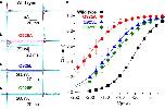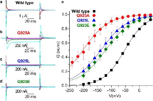 Figure 6. Transient charge movement in 125 mM Na+ without external K+. (a–d) Ouabain-sensitive currents elicited by voltage pulses from –50 mV to –180 mV (cyan), −140 mV (green), −100 mV (magenta), −60 mV (blue), −20 mV (red) and + 20 mV (black), in representative oocytes injected with wild type (a), Q925A (b), Q925L (c) and Q925E (d). (e) Normalized charge-voltage plots. Data points represent the mean ± s.d. Line plots are Boltzmann distributions (Eq. 5 in Methods) fitted to individual experiments with slope factors 38 mV for wild type, 46 mV for Q925A, 48 mV for Q925L, and 46 mV for Q925E. V0.5 values, and the corresponding fold changes in Na+ affinity calculated, are shown in Table 3 with further information on statistics.
