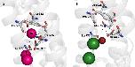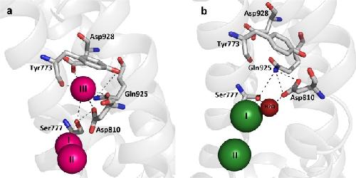 Figure 7. Ion-binding sites in Na+, K+-ATPase crystal structures with indication of Q925 (Gln925) and other relevant site-III residues. (a) Na+-bound [Na3]E1·AlF4− ADP form (mimicking the transition state between Na3E1 and [Na3]E1P, see Fig. 1), Protein Data Bank code 3WGV, chain A (protomer B)14. Na+ ions are shown as pink spheres numbered I, II, and III according to standard nomenclature. (b) K+-bound [K2]E2·MgF42– form (mimicking the [K2]E2·Pi intermediate between K2E2P and [K2]E2), Protein Data Bank code 2ZXE13. K+ ions are shown as green spheres numbered I and II, and the associated water molecule is red. View along the plane of the membrane with the intracellular side up, for both structures. Selected residues are shown in stick representation coloured according to the elements (carbon, grey; oxygen, red; nitrogen, blue) and numbered according to the rat α1-isoform (Q925 of rat α1 corresponds to Q923 and Q930 in the crystallized pig α1 and shark rectal gland enzymes, respectively). Broken lines indicate potential hydrogen bonds or coordination bonds between ions and oxygen ligands of residue side chains.