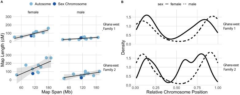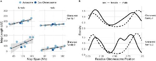 Fig 7. A) Linkage map length in centimorgans (cM) is positively correlated with the length of the genomic region in millions of base pairs (Mb) in females (left) but not in males (right) from Family 1 and Family 2 (top and bottom rows, respectively). B) Crossover density is more strongly biased towards chromosome tips in males than females in Family 1 and Family 2.