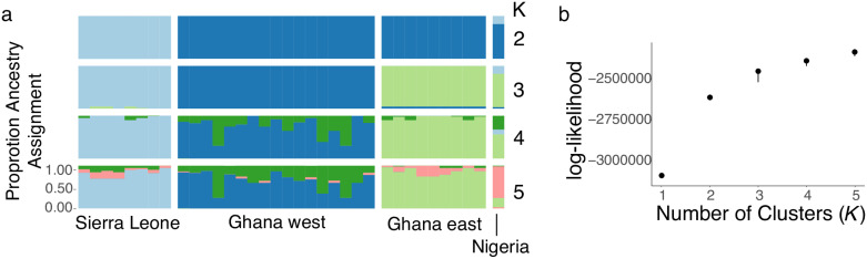 Fig 1. Genetic cluster analysis of RRGS data illustrates geographic structure of wild X. tropicalis.(a) Ancestry assignments of individual samples for 2–5 populations (K). (b) log-likelihood of values of K from 1–5.
