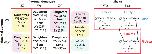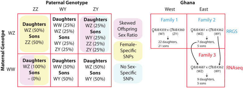 Fig 2. The three sex chromosomes of X. tropicalis can be crossed in six ways to produce offspring with different types of sex-linkage and/or skewed offspring sex ratios (left). Crosses on the left that are not shaded are expected to have male-specific SNPs passed from father to all sons in the male-specific portion of the Y chromosome. We generated three laboratory families from west and east Ghana for RRGS and RNAseq analyses (right). For the RNAseq analysis (Family 3), offspring were analyzed from a cross between the father and a daughter from Family 2 (indicated with arrows). On the right, putative sex chromosome genotypes described in main text are in parentheses with a question mark indicating either a W or a Z chromosome.
