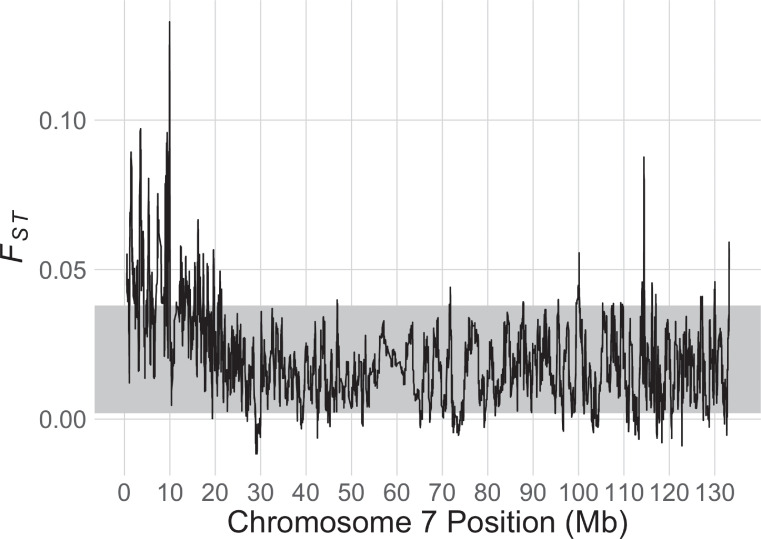 Fig 3. FST between females and males for X. tropicalis chromosome 7 of wild samples from Ghana, and georeferenced lab strains from Nigeria and Sierra Leone.The grey band represents the whole genome bootstrap confidence intervals for the mean FST that were generated by resampling FST measured on the autosomes.