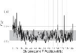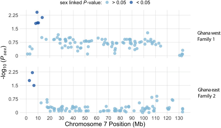 Fig 4. Manhattan plot of association between genotype and sex phenotype for chromosome 7 in Family 1 from Ghana west (top) and Family 2 from Ghana east (bottom) for paternal heterozygous sites.For both families, light dots indicate variants that are not significantly associated with sex, and dark dots indicate significant associations with sex after FDR correction (top) or before FDR correction (bottom). As discussed in the main text, we did not apply FDR correction for Family 2 due to a smaller dataset.