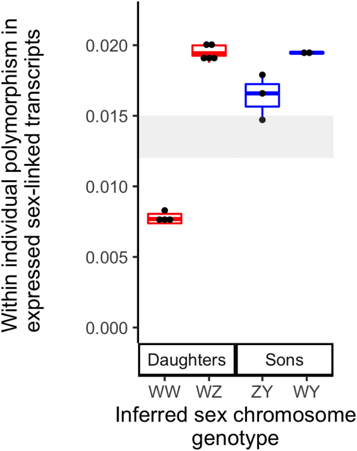 Fig 5. In daughters and sons of Family 3, two distinct levels of within individual polymorphism in expressed sex-linked transcripts imply that there are two distinct sex chromosome genotypes in offspring of each sex.Inferred sex chromosome genotypes (x-axis) are based on within individual polymorphism of expressed sex-linked transcripts (y-axis). The range of pairwise nucleotide diversity for non-sex-linked transcripts in the 14 individuals for which RNAseq was performed is depicted in gray.
