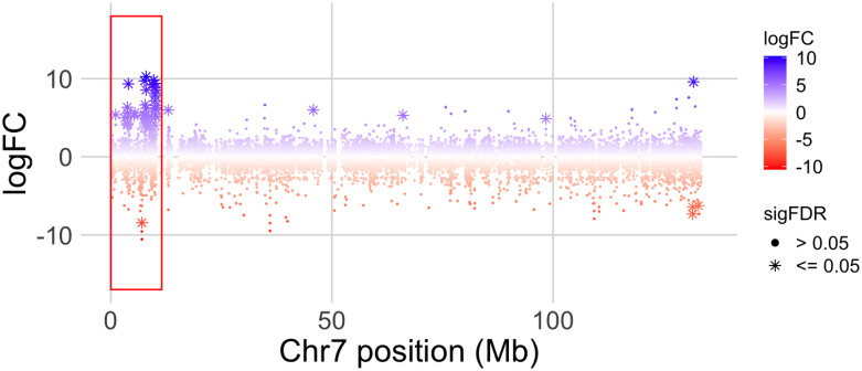 Fig 6. Log2 transformed male/female transcript expression ratio (logFC) along X. tropicalis chromosome 7 in offspring of Family 3.The x-axis indicates the genomic coordinates in millions of base pairs (Mb). Small dots represent individual transcripts and * represent transcripts that are significantly differentially expressed after FDR correction (sigFDR). Positive values reflect male biased expression, negative values are female biased. A red box highlights a cluster of genes on the sex-linked portion of chromosome 7 with mostly male-biased expression.