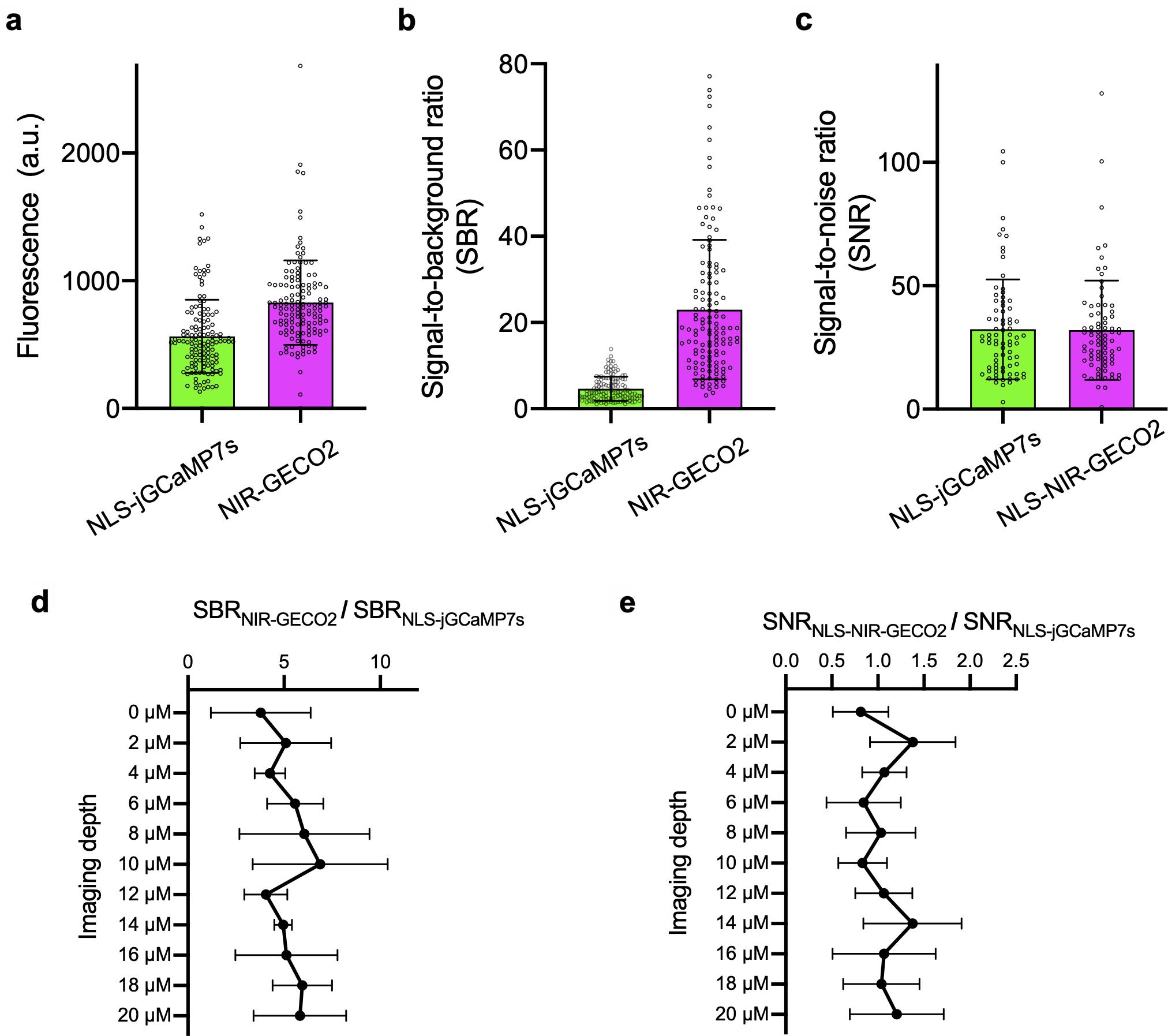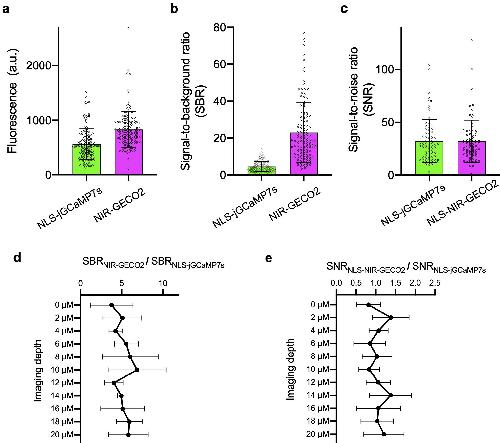 (a) Fluorescence intensity of NLS-jGCaMP7s and NIR-GECO2 in C. elegans neurons at resting state. Fluorescence was normalized to the same excitation intensity (n = 132 ROIs from 5 worms; data are shown as mean ± SD) (b) SBR of NLS-jGCaMP7s and NIR-GECO2 in neurons of C. elegans at resting state (n = 132 ROIs from 5 worms; data are shown as mean ± SD). SBR was obtained via dividing the fluorescence intensity from neurons by the averaged autofluorescence from the intestine area. (c) SNR of NLS-jGCaMP7s and NLS-NIR-GECO2 quantified from spontaneously spiking neurons (n = 78 ROIs from 4 worms; data are shown as mean ± SD). SNR was calculated by dividing the fluorescence change associated with a spike by the SD of the baseline fluorescence over the 2-second period immediately before the spike. (d) The ratio of SBRNIR-GECO2 to SBRNLS-jGCaMP7s at different imaging depths (n = 5 worms; data are shown as mean ± SD). (e) The ratio of SNRNLS-NIR-GECO2 to SNRNLS-jGCaMP7s at different imaging depths (n = 4 worms; data are shown as mean ± SD). NIR-GECO2 (without NLS) and NLS-jGCaMP7s were used for the experiments in a, b, and d; NLS-NIR-GECO2 and NLS-jGCaMP7s were used for the experiments in c and e. The underlying data for aâe can be found in S1 Data. ROI, region of interest; SBR, signal-to-background ratio; SD, standard deviation; SNR, signal-to-noise ratio.