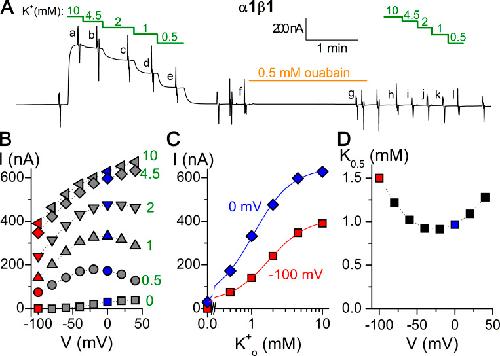 Figure 2. Recording and analysis of an experiment to determine the K0.5 for K+o. (A) Current at â50 mV of a Na+-loaded oocyte overexpressing the α1β1 pump, bathed in Na+o solution. Substituting Na+o with K+o stimulated outward current in a [K+]-dependent manner. Application of 0.5 mM ouabain for 2 min blocked currents in subsequent K+ applications. Vertical deflections along the recording indicate pulses to voltages between â100 and +40 mV. Lowercase letters indicate currents used to obtain ouabain-sensitive currents in B. (B) I-V plot of ouabain-sensitive current (current before ouabain application â current after ouabain application in the same condition) measured during the last 5 ms of 100-ms-long voltage pulses. (C) [K+o] dependence of ouabain-sensitive current at â100 and 0 mV fitted with Hill equations (line plots). (D) Voltage dependence of K0.5 for K+o. |