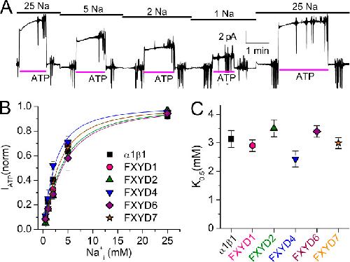 Figure 10. FXYD effects on Na/K pump interaction with Na+i in the presence of K+i. (A) Patches from oocytes expressing each FXYD protein were held at 0 mV with extracellular solution containing 5 mM K+o in NMDG. The bars on top indicate [Na+]i (in mM), and the bars under the traces indicate application of MgATP (4 mM) to activate outward Na/K pump current. Vertical deflections correspond to application of 25-ms-long voltage pulses. Note biphasic activation by ATP. (B) Mean ATP-induced current as a function of [Na+]i, normalized to the value at 50 mM Na+i. Line plots are Hill equations with the parameters in Table 3. (C) K0.5,Na+ for each FXYD, from the number of experiments in parentheses. Error bars are SEM. |