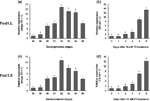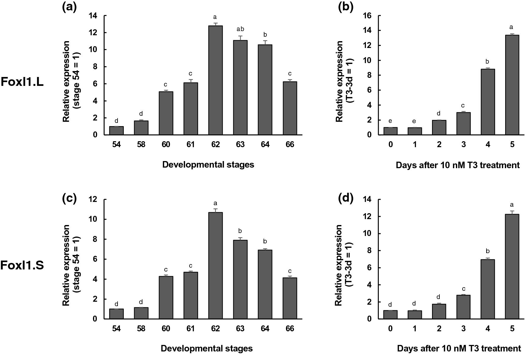 Figure 1. Expression profiles of Foxl1 homeolog mRNAs in the small intestine during natural and T3-induced metamorphosis. Total RNA was prepared from the intestine of X. laevis tadpoles at indicated developmental stages (a,c) or Nieuwkoop and Faber (NF) stage 54-tadpoles after 10 nM T3 treatment (b,d) and was analyzed by qRT-PCR. Levels of Foxl1.L (a,b) and Foxl1.S mRNAs (c,d) are shown relative to those of ribosomal protein L8 (rpL8.S) mRNA, with the values at stage 54 or T3 for 0 day set to 141,42,43. Error bars represent the SEM (nâ=â4). The values were analyzed by ANOVA followed by Scheffeâs post hoc test. Different letters indicate significant differences among the indicated stages or days after T3 treatment (Pâ<â0.05).