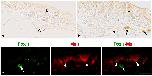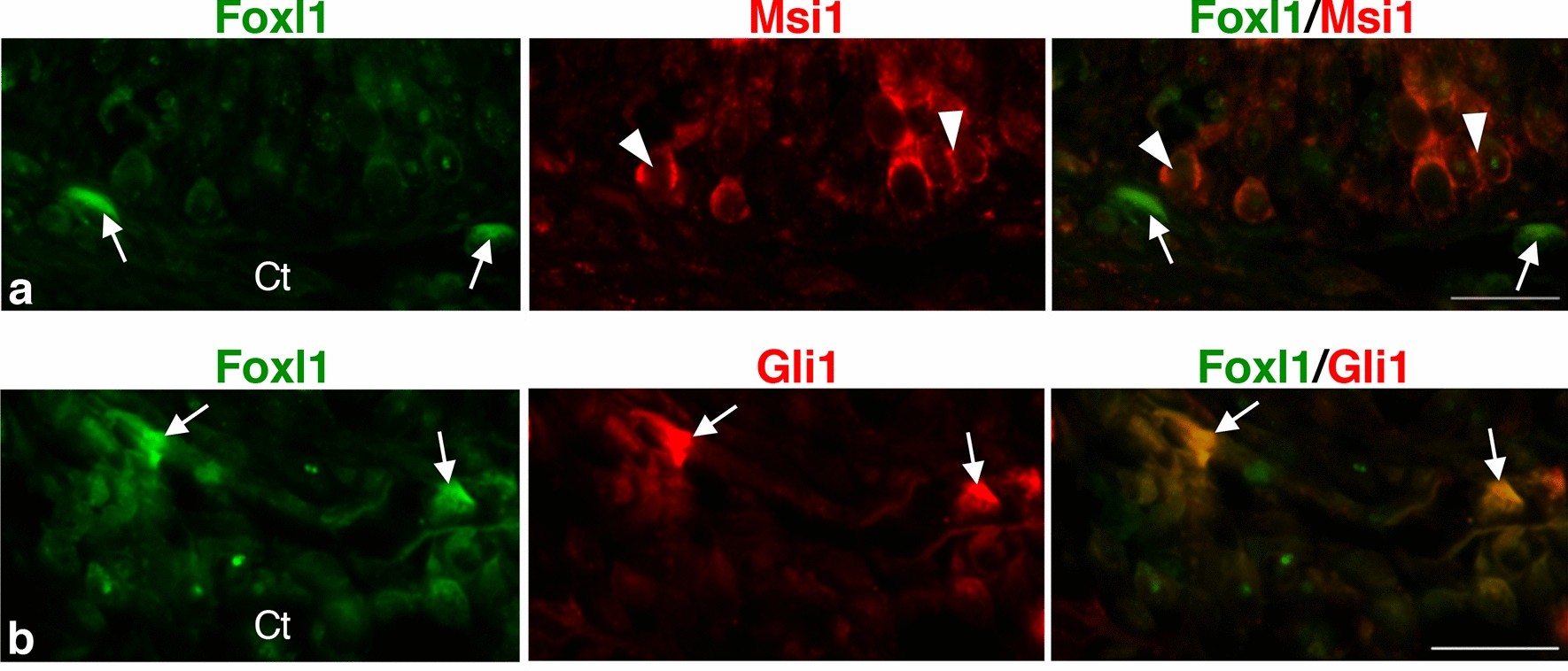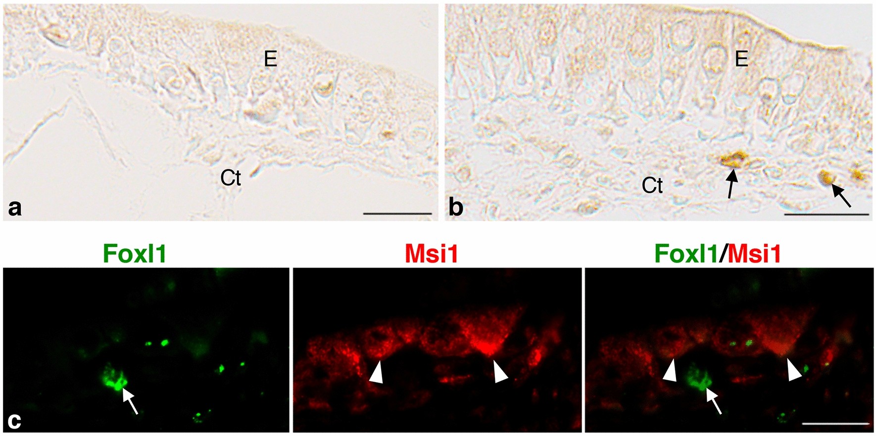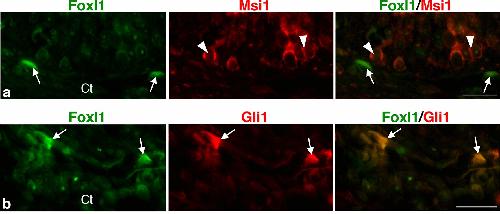 Figure 4. Correlation between Foxl1 expression and the expression of Msi1, an adult stem cell marker, and that of Gli1 in the X. laevis intestine at stage 61. Cells positive for Foxl1 (a,b), arrows) are localized in the connective tissue (Ct) close to primordia of the adult epithelium expressing Msi1 ((a), arrowheads). Most of them are also positive for Gli1 ((b), arrows). Bars, 20 μm.