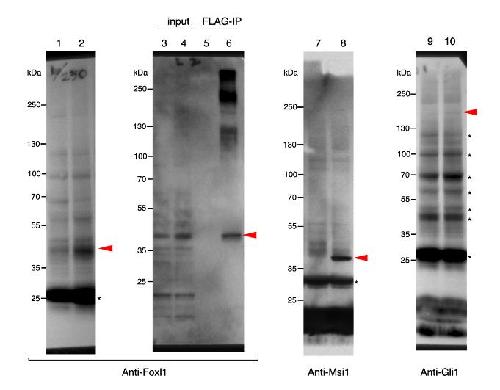 Figure S1. The antibodies specifically recognize X. laevis proteins. In vitro-translated (IVT) proteins (1. non-template control, 2. Foxl1.L, 7. non-template control, 8. Msi1.L, 9. non-template control, 10. Gli1.S) produced by TNT T7 or SP6, and input and FLAG-IP samples prepared from X. laevis embryos (3, 5. uninjected, 4, 6. FLAG-Foxl1.L mRNA-injected) were analyzed by Western blotting using the indicated antibodies. Arrowheads indicate the specific signals with the expected molecular weights. Asterisks indicate non-specific signals as they are also detected in the negative controls. Note, anti-Foxl1 antibody also detected the endogenous Foxl1 (lane 3). Only a weak signal for Gli1 was detected due to low protein production. Full-length blots are presented.