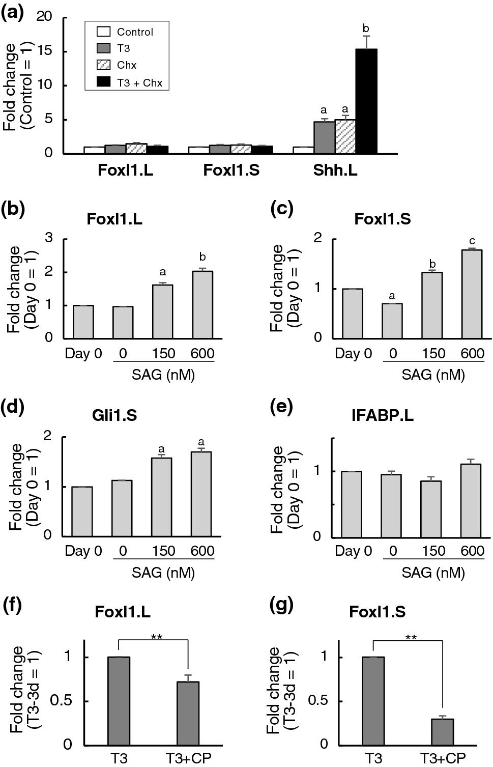 Figure 2. T3 indirectly induces the mRNA expression of Foxl1 homeologs through Shh signaling. (a) Total RNA was isolated from the intestine of premetamorphic stage 54-tadpoles treated with DMSO (Control, white bars), 50 nM T3+DMSO (T3, gray bars), cycloheximide and anisomycin (Chx, shaded bars) and 50 nM T3+Chx (T3+Chx, black bars) for 6 h following the pretreatment with DMSO or Chx for 1 h. mRNA levels of indicated genes were examined by qRT-PCR and shown relative to those of rpL8.S mRNA, with the value of Control set to 1. Error bars represent the SEM (nâ=â4). The values were analyzed by ANOVA followed by Scheffeâs post hoc test. Different letters indicate significant differences among the indicated treatment (Pâ<â0.05). When both Control vs T3 and Chx vs T3+Chx were statistically significant, the gene was determined as the direct TH response gene. (bâe) Premetamorphic tadpoles at stage 54 were pretreated with DMSO for 4 days. Then, total RNA was isolated from the intestine at 0 day or 1 day after treatment with 0, 150 or 600 nM SAG. mRNA levels of indicated genes were examined by qRT-PCR and shown relative to those of rpL8.S mRNA, with the value at day 0 set to 1. Error bars represent the SEM (nâ=â6 for Foxl1.L, nâ=â5 for Foxl1.S, nâ=â3 for Gli1.S and IFABP.L). The values were analyzed by ANOVA followed by Scheffeâs post hoc test. Different letters indicate significant differences among the indicated treatment (Pâ<â0.05). (f,g) Premetamorphic tadpoles at stage 54 were treated with 10 nM T3 in the presence of 2.5 mM cyclopamine (CP) or ethanol vehicle for 3 days. Then, total RNA was isolated from the intestine. mRNA levels of indicated genes were examined by qRT-PCR and shown relative to those of rpL8.S mRNA, with the value of T3 plus ethanol vehicle for 3 days set to 1. Error bars represent the SEM (nâ=â3). The values were analyzed by Studentâs t-test. Asterisks indicate that the mRNA levels are significantly different. **Pâ<â0.01.