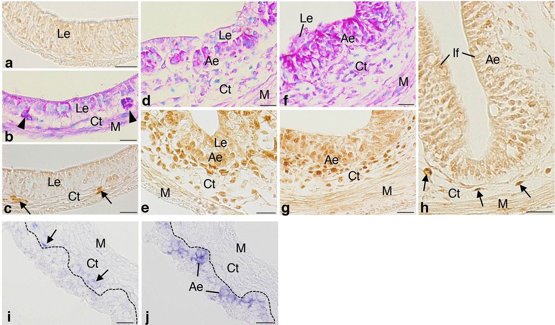 Figure 3. Spatio-temporal expression of Foxl1 in the X. laevis intestine during metamorphosis. Cross sections were immunostained with anti-Foxl1 antibody (a,c,e,g,h) and stained with methyl green-pyronin (b,d,f), or hybridized with antisense Foxl1 (i) or c-Myc probes (j). (a) Stage 57. No cell is positive for Foxl1. (b,c) Stage 60. Adult stem/progenitor cells appear as islets strongly stained red with pyronin ((b), arrowheads) between the larval epithelium (Le) and the connective tissue (Ct). Some connective tissue cells become positive for Foxl1 ((c), arrows). (d,e) Stage 61. Both primordia of the adult epithelium (Ae) and the connective tissue increase in cell number (d). Connective tissue cells positive for Foxl1 become numerous close to the adult epithelial primordia (e). (f,g) Stage 62. The adult epithelium mostly replaces the larval one (f). Most of the connective tissue cells surrounding the adult epithelium are positive for Foxl1 (g). (h) Stage 66 (end of metamorphosis). Connective tissue cells positive for Foxl1 (arrows) are small in number and tend to be localized in the trough of newly-formed intestinal folds (If). (i,j) Stage 62. Foxl1 mRNA (i, arrows) is detected as dark blue deposits in the connective tissue cells close to adult epithelial primordia expressing c-Myc (j). The dashed-lines indicate the boundary of the epithelium and connective tissue. M; muscles. Bars, 20 μm.