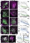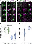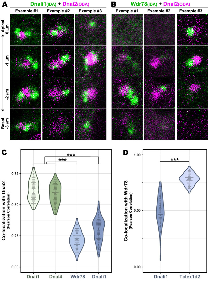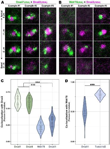 Figure 2âfigure supplement 1. Co-localization data for IDAs and ODAs in DynAPs. (A) En face optical Z-sections through DynAPs possessing GFP-Dnali1 and mCherry-Dnai2. (B) En face optical Z-sections through DynAPs possessing GFP-Wdr78 and mCherry-Dnai2. (C) Graph displaying Pearson correlation for colocalizations of GFP fusion dynein subunits, Dnai1 (n = 82), Dnal4 (n = 83), Wdr78 (n = 73) and Dnali1 (n = 83), with mCherry-Dnai2 at DynAPs. p-value (***)<0.0000001 by one-way ANOVA and post-hoc Tukey-Kramer HSD test. (D) Graph displaying Pearson correlation for colocalization of two different IDA subunits, GFP-Dnali1 (n = 65) and GFP-Tctex1d2 (n = 67) with mCherry-Wdr78 at DynAPs. p-value (***)<2.2e-16 by Welch Two Sample t-test. |