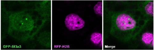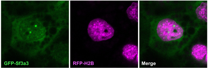 Figure 4âfigure supplement 1. Sf3a3-GFP (green) also localizes to speckles within the nucleus (labeled with RFP-Histone2B, red) in a Xenopus MCC. |