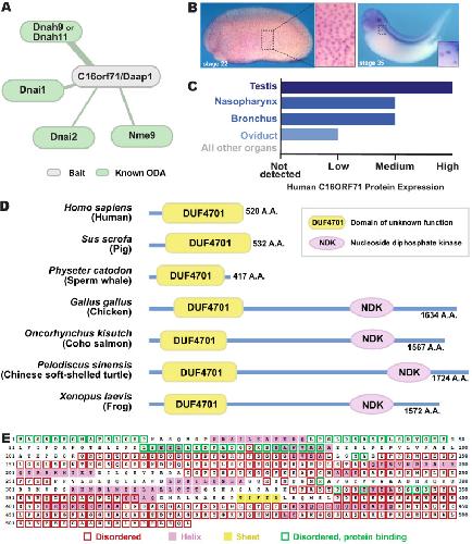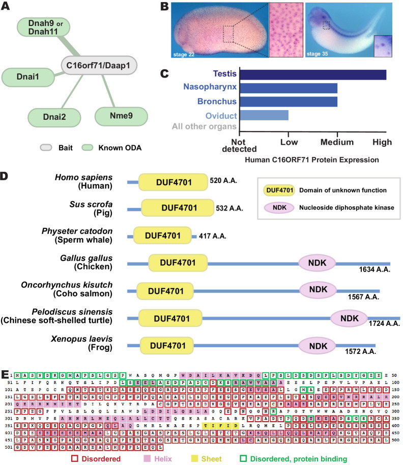 Figure 5. C16orf71/Daap1 is a novel ODA interactor specifically expressed in MCCs.(A) Spoke diagram displaying C16orf71/Daap1 interactors; line weight indicates Log2 fold- change of PSMs. (B) In situ hybridization of Daap1 in Xenopus reveals expression in epidermal MCCs (left) and MCCs in the nephrostomes (right). (C) Graph showing C16orf71 protein expression levels in human tissues from the Human Protein Atlas (Uhlén et al., 2015). (D) Domain organization of C16orf71/Daap1 orthologs across vertebrates from NCBI Orthologs. (E) Domain prediction with human C16orf71/DAAP1 sequence from the PSIPRED Protein Analysis Workbench for disorder and secondary structure prediction. |