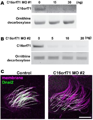 Figure 9âfigure supplement 1. Validation of C16orf71 morpholinos. (AâB) RT-PCR shows effective disruption of splicing by injection of C16orf71 MO #1 (A) and #2 (B). Ornithine decarboxylase (ODC) was used as a loading control for the RT-PCR. (C) Apical surface views labeled by membrane-RFP (magenta) and GFP-Dnai2 (green). Loss of C16orf71 by MO #2 results in reduction of Dnai2 in the axoneme, while GFP-Dnai2 reveals normal localization in control. Scale bar = 10 µm. |