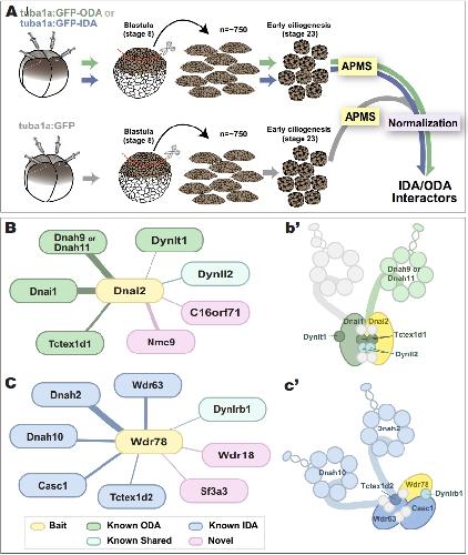 Figure 3. Specific identification of outer and inner arm dynein interactors. (A) Schematic of APMS workflow for identifying in vivo ODA and IDA interactors. GFP-tagged ODA or IDA driven by MCC-specific alpha-tubulin promoter by plasmid injection into Xenopus embryos and animal caps were isolated at stage 8. The cultured explants were collected at early ciliogenesis stage (stage 23) and subjected to APMS. Unfused GFP was assessed simultaneously and the data subtracted to control for non-specific interactions. (B) Spoke diagram displaying Dnai2 (ODA) interactors, line weight of spokes indicates Log2 fold-change of PSMs. bâ. Schematic of outer dynein arm indicating identified Dnai2 preys. (C) Spoke diagram displaying Wdr78 (IDA) interactors. câ. Schematic of inner dynein arm (f type) indicating identified Wdr78 preys. |