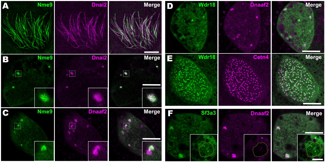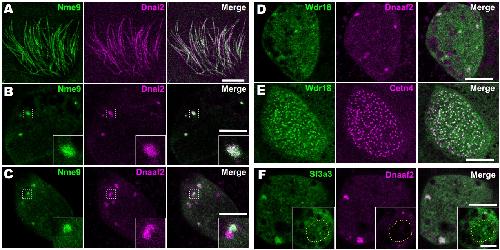 Figure 4. Localization of novel IDA and ODA interactors. (A) En face optical section just above the apical surface of a Xenopus MCC showing axonemal localization of GFP-Nme9. (B) A similar optical section through the MCC cytoplasm shows near-perfect colocalization of GFP-Nme9 with the ODA subunit mCherry-Dnai2 in DynAPs. Dashed box indicates area shown at higher magnification in the inset. (C) GFP-Nme9 only partially co-localizes with mCherry-Dnaaf2. (D) En face optical section through the cytoplasm shows colocalization of GFP-Wdr18 with mCherry-Dnaaf2 in DynAPs. (E) A similar section just below the MCC apical surface reveals GFP-Wdr18 localization near basal bodies labeled with RFP-Centrin4 (F) GFP-Sf3a3 colocalizes with mCherry-Dnaaf2. Scale bars = 10 mm. |