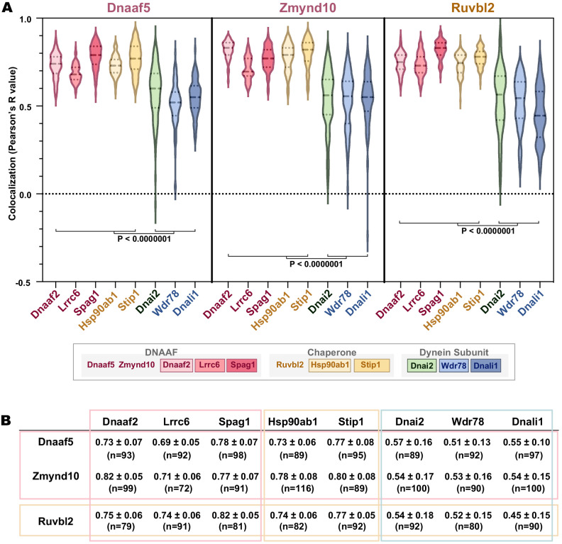 Figure 1âfigure supplement 1. Quantification of localization data. (A) Graph displaying Pearson correlation for colocalizations between DNAAF, chaperone or dynein subunits. Dnaaf5, Zmynd10 and Ruvbl2 were tagged with mCherry. GFP fusion proteins are Dnaaf2, Lrrc6, Spag1, Hsp90ab1, Stip1, Dnai2, Wdr78 and Dnali1. p-value<0.0000001 by one-way ANOVA and post-hoc Tukey-Kramer HSD test. (B) Table showing Pearsonâs R values (Average ± STDEV) and n-value for each colocalization analysis (at least 15 cells from five embryos for each analysis). |