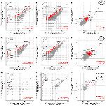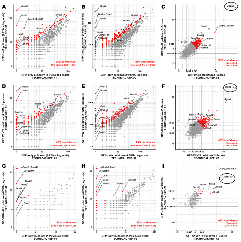 Figure 3âfigure supplement 1. Proteins co-precipitating with Dnai2, Wdr78, and C16orf71 by APMS. Interaction partners of (A-C) Dnai2, (D-F) Wdr78, and (G-I) C16orf71 were identified based on their enrichment in APMS of the GFP-tagged bait proteins (vertical axes, panels A-B, D-E, G-H) relative to APMS of the untagged GFP controls (horizontal axes, panels A-B, D-E, G-H). A pseudocount of 1 PSM was added to each protein for visualization on a log-log plot (panels A-B, D-E, G-H). For visualization purposes, each protein was colored according to a 95% confidence threshold using a one-sided Z-test (see Materials and methods). We observed reasonable concordance between technical replicates, evident in comparisons of the measured Z-scores for proteins co-precipitating with (C) Dnai2, (F) Wdr78, and (I) C16orf71. Baits are circled in C, F, I. A joint Z-score was calculated for each protein observed across a pair of technical replicates by summing the Z-score for each protein in each replicate and dividing by the square root of N replicates (N = 2). Multiple-hypothesis corrected p-values derived from these joint Z-scores are provided in the corresponding Suppl. Tables. |