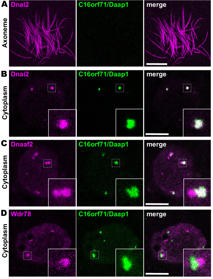 Figure 6. Daap1 is a DynAP-specific protein in Xenopus MCCs.(A) En face optical section above the apical surface of a Xenopus MCC reveals absence of GFP-Daap1 in axonemes. (B) A similar optical section through the MCC cytoplasm shows near-perfect colocalization of GFP-Daap1 with the ODA subunit mCherry-Dnai2 in DynAPs. Inset shows higher magnification view of dashed box for each panel. (C) GFP-Daap1 only partially co-localizes with mCherry-Dnaaf2. (D) GFP-Daap1 co-localizes only very weakly with the IDA subunit mCherry-Wdr78. Scale bars = 10 µm. |