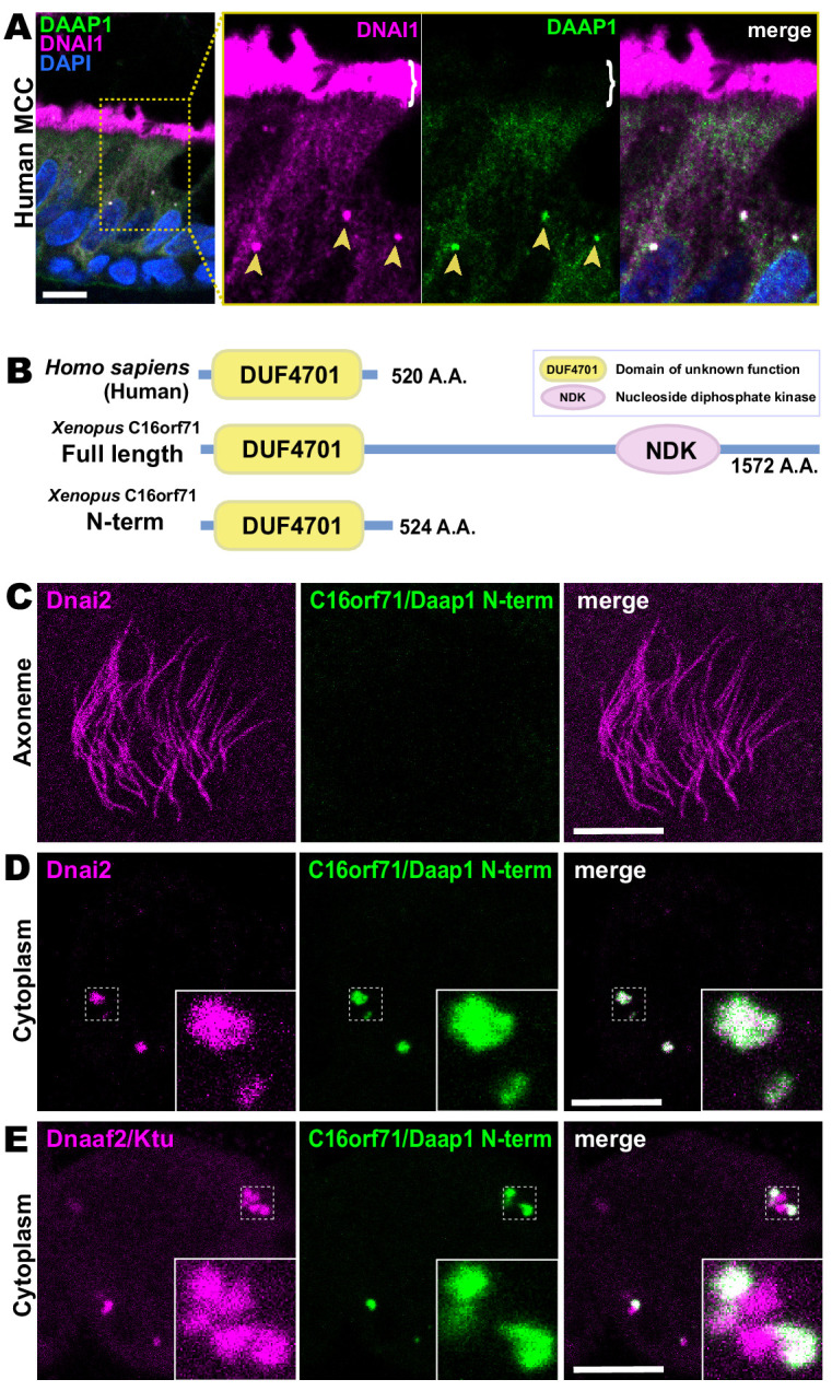 Figure 7. Human DAAP1 is a DynAP-specific protein.(A) A primary human lung section immunostained for human DAAP1 (green) and the ODA subunit DNAI1 (magenta). Boxed area indicates magnified region shown at right. DNAI1 strongly labels MCC axonemes (bracket) and also DynAPs in the cytoplasm (arrowheads). As in Xenopus, human DAAP1 is not present in axonemes but is strongly enriched in DynAPs. (DAPI (blue) marks nuclei; scale bar = 10 µm) (B) Schematic of C16orf71 constructs: Xenopus Daap1-Nterm is truncated, containing only the DUF4701 domain, similar to human DAAP1. (C) En face optical section above the apical surface of a Xenopus MCC reveals absence of Daap1-Nterm-GFP in axonemes. (D, E) Similar optical sections through the cytoplasm shows near-perfect colocalization of GFP-Daap1-Nterm with the ODA subunit mCherry-Dnai2 and only partial co-localization with Dnaaf2/Ktu. In all cases, inset shows higher magnification view of dashed box for accompanying panels. Scale bars = 10 µm. |