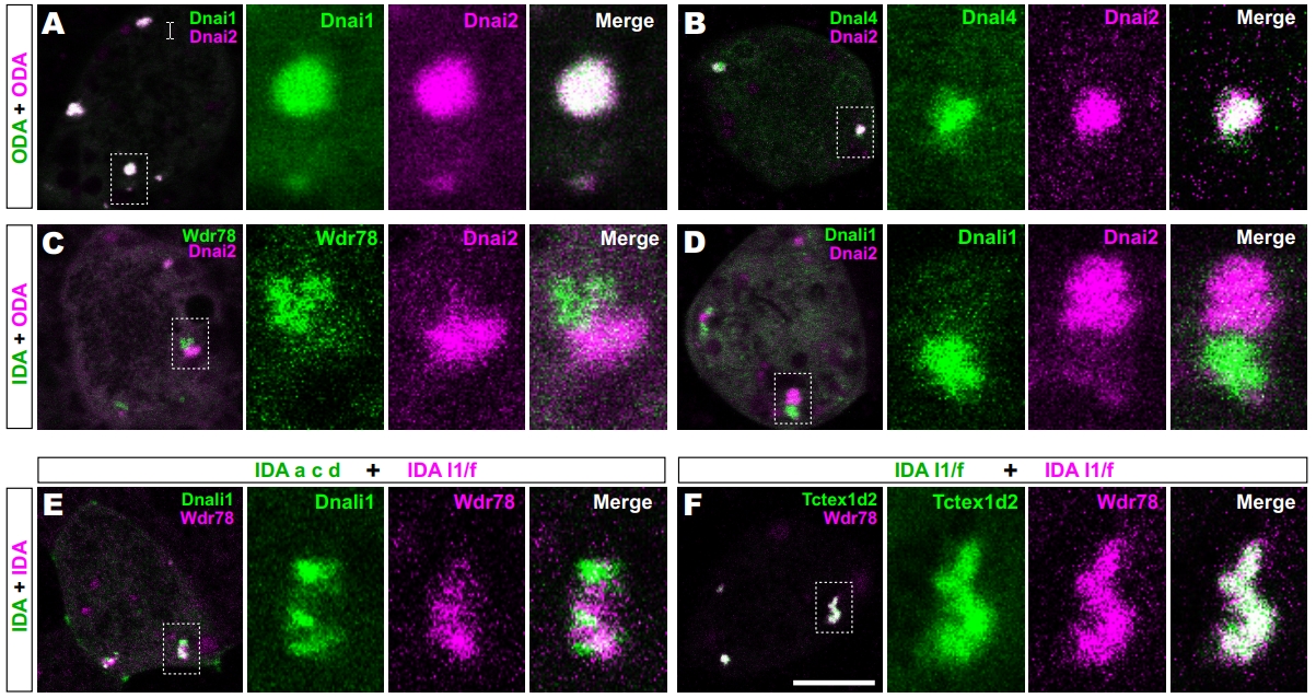 Figure 2. Outer and inner dynein arms localize to distinct sub-regions in DynAPs. (A) En face optical section of a Xenopus MCC expressing ODA subunits GFP-Dnai1 and mCherry-Dnai2 (as per lower inset in Figure 1A). The dashed box indicates the area shown at higher magnification in the panels to the right. Note near complete co-localization. (B) mCherry-Dnai2 also displays near-total co-localization with another ODA subunit, Dnal4. (C, D) mCherry-Dnai2 shows very little co-localization with the IDA subunit GFP-Wdr78 or GFP-Dnali1. (E) IDA-f subunit mCherry-Wdr78 displays little colocalization with IDA-a, c, d subunit GFP-Dnali1. (F) IDA-f subunits, mCherry-Wdr78 and GFP-Tctex1d2, show complete co-localization. Scale bar = 10 mm. |