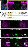 Figure 2. Outer and inner dynein arms localize to distinct sub-regions in DynAPs. (A) En face optical section of a Xenopus MCC expressing ODA subunits GFP-Dnai1 and mCherry-Dnai2 (as per lower inset in Figure 1A). The dashed box indicates the area shown at higher magnification in the panels to the right. Note near complete co-localization. (B) mCherry-Dnai2 also displays near-total co-localization with another ODA subunit, Dnal4. (C, D) mCherry-Dnai2 shows very little co-localization with the IDA subunit GFP-Wdr78 or GFP-Dnali1. (E) IDA-f subunit mCherry-Wdr78 displays little colocalization with IDA-a, c, d subunit GFP-Dnali1. (F) IDA-f subunits, mCherry-Wdr78 and GFP-Tctex1d2, show complete co-localization. Scale bar = 10 mm. |