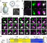 Figure 1. Dynein subunits occupy sub-regions within DynAPs. (A) Schematic showing an MCC. The upper inset shows a schematic cross section through an axoneme indicating the relative positions of ODAs and IDAs; the lower inset shows a representative en face optical section through the MCC cytoplasm with dynAPs indicated DynAPs. (B) En face optical section through the cytoplasm of a Xenopus MCC expressing GFP-Stip1 (a chaperone, green) and mCherry-Dnaaf5 (a DNAAF, magenta). Note near-perfect co-localization. Dashed box indicates region shown in high magnification, split-channel views at right. Scale bars = 10 mm. (C) GFP-Dnai2 (a dynein subunit, green) co-localizes only partially with mCherry-Dnaaf5. (D, E) Images showing enlarged views of individual DynAPs after pairwise labeling with the indicated tagged DNAAFs or chaperones. Smaller panels show split channels, larger images show the merged channels. Note high degree of co-localization. (F) Similar pair-wise labeling with dynein subunits reveals only partial co-localization. Scale bar = 1 mm for panels D-F. (G) Heatmap showing Pearson correlation for colocalization of GFP fusion proteins with mCherry fusion proteins. Yellow indicates high value (Pearsonâs R value = 0.85), while blue indicates low value (Pearsonâs R value = 0.45). Exact Pearsonâs R values for each protein combination can be found in Figure 1âfigure supplement 1. |