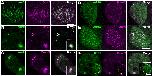 Figure 2. Outer and inner dynein arms localize to distinct sub-regions in DynAPs. (A) En face optical section of a Xenopus MCC expressing ODA subunits GFP-Dnai1 and mCherry-Dnai2 (as per lower inset in Figure 1A). The dashed box indicates the area shown at higher magnification in the panels to the right. Note near complete co-localization. (B) mCherry-Dnai2 also displays near-total co-localization with another ODA subunit, Dnal4. (C, D) mCherry-Dnai2 shows very little co-localization with the IDA subunit GFP-Wdr78 or GFP-Dnali1. (E) IDA-f subunit mCherry-Wdr78 displays little colocalization with IDA-a, c, d subunit GFP-Dnali1. (F) IDA-f subunits, mCherry-Wdr78 and GFP-Tctex1d2, show complete co-localization. Scale bar = 10 mm. |