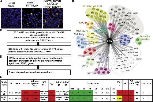 Congenital anomalies of the kidney and urinary tract (CAKUT) constitute one of the most frequent birth defects and represent the most common cause of chronic kidney disease in the first three decades of life. Despite the discovery of dozens of monogenic causes of CAKUT, most pathogenic pathways remain elusive. We performed whole-exome sequencing (WES) in 551 individuals with CAKUT and identified a heterozygous de novo stop-gain variant in ZMYM2 in two different families with CAKUT. Through collaboration, we identified in total 14 different heterozygous loss-of-function mutations in ZMYM2 in 15 unrelated families. Most mutations occurred de novo, indicating possible interference with reproductive function. Human disease features are replicated in X. tropicalis larvae with morpholino knockdowns, in which expression of truncated ZMYM2 proteins, based on individual mutations, failed to rescue renal and craniofacial defects. Moreover, heterozygous Zmym2-deficient mice recapitulated features of CAKUT with high penetrance. The ZMYM2 protein is a component of a transcriptional corepressor complex recently linked to the silencing of developmentally regulated endogenous retrovirus elements. Using protein-protein interaction assays, we show that ZMYM2 interacts with additional epigenetic silencing complexes, as well as confirming that it binds to FOXP1, a transcription factor that has also been linked to CAKUT. In summary, our findings establish that loss-of-function mutations of ZMYM2, and potentially that of other proteins in its interactome, as causes of human CAKUT, offering new routes for studying the pathogenesis of the disorder.
