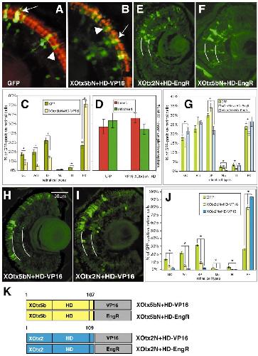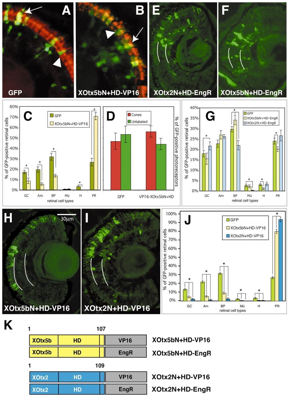 Fig. 5. Effects of VP16 or Engrailed fusion constructs of XOtx5b and XOtx2 on retinal cell fate decisions. (A,B) Cryostat sections (10 μ m) of retinas lipofected with (A) GFP and the pCS2+ vector or (B) XOtx5bN+HD-VP16 and GFP then stained with an anti-cone photoreceptor antibody (calbindin in red). Arrowheads indicate cells that fluoresce with GFP alone (green) and arrows indicate cells expressing both GFP and calbindin (yellow). (C) Graph showing an increase in the distribution of GFP-positive photoreceptor cells in retinas colipofected with XOtx5bN+HD-VP16 and GFP (n=344) when compared to GFP and pCS2+ (n=493). Values were calculated as in Fig. 4D,E; Pâ¤0.04. In C,D,G and J asterisks indicate P values as calculated using a Student's t-test; n=the total number of retinal cells counted; error bars, s.e.m. (D) Graph showing the types of photoreceptor cells produced in retinas co-lipofected with GFP and pCS2+ (n=184) or VP16-XOtx5bHD and GFP (n=267). Cells positive for GFP (unlabelled) or GFP and calbindin (cones) were counted in one retina and the percentage of each determined. Percentages from both cones and unlabeled cells were averaged in all retinas counted. The error bar indicates s.e.m. Even though a larger number of photoreceptors were produced in XOtx5bN+HD-VP16 lipofected retinas (C), cones and unlabeled cell numbers were similar to each other in retinas lipofected with either XOtx5bN+HD-VP16 or the control construct. (E) Cryostat section (10 μ m) of a retina co-lipofected with GFP and XOtx2N+HD-EngR, which shows a decreased number of bipolar cells. White lines (also in F-H) mark the inner and outer plexiform layers. (F) GFP and XOtx5bN+HD-EngR co-lipofected retina (10 μm cryostat section) showing a distinct decrease of fluorescently labelled photoreceptor cells. (G) The percentage of GFP-positive photoreceptor cells in the XOtx5bN+HD-EngR+GFP (n=651) co-lipofected retinas is decreased while the percentage of GFP-positive bipolar cells is decreased in the XOtx2N+HD-EngR+GFP (n=474) co-lipofected retinas when compared to controls (GFP and pCS2+, n=692). This is a representative experiment. Lipofection of each construct with the control was repeated in two separate experiments, resulting in identical population shifts as shown [XOtx2N+HD-EngR+GFP (n=1692); XOtx5bN+HD-EngR+GFP (n=2121)]. Pâ¤0.05, (H-I) Sagittal section of stage 41 retinas that have been co-lipofected with GFP and either (H) XOtx5bN+HD-VP16 or (I) XOtx2N+HD-VP16. In both, there are a large number of labelled photoreceptor cells. Scale bar: 30 μm. (J) The percentage of each retinal cell type, which is GFP-positive, in retinas lipofected with XOtx5bN+HD-VP16 (n=342) or XOtx2N+HD-VP16 (n=294) and GFP. GFP and the expression vector alone acted as the control (n=535). Nearly all of the GFP-positive cells are photoreceptors in the experimental lipofected retinas. The asterisk denotes significant differences between the control and each of the constructs lipofected (Pâ¤0.02); GC, ganglion cells; Am, amacrine cells; BP, bipolar cells; Mü, Müller cells; H, horizontal cells; PR, photoreceptor cells. (K) A schematic of the constructs used in the above lipofections. HD, homeodomain. The numbers above the bars indicate the amino acid residues.
