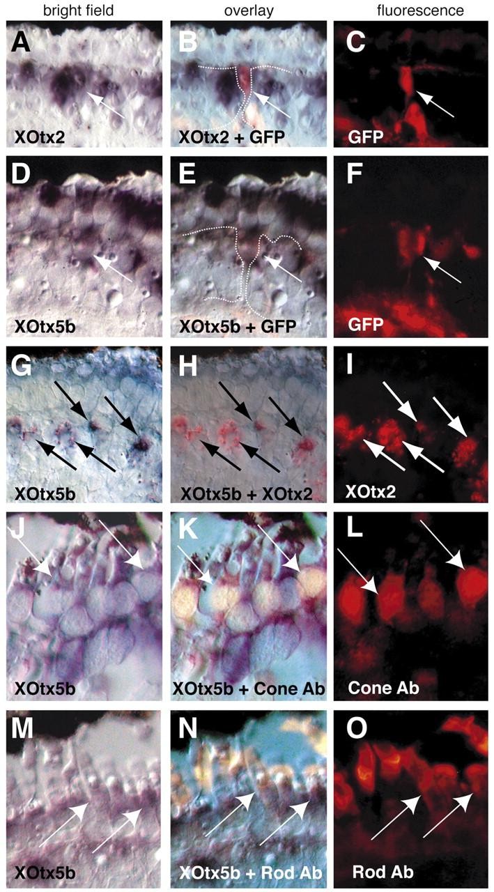 Fig. 3. Identification of cells expressing XOtx2 and XOtx5b. XOtx2 is expressed in bipolar cells. (A) Sagittal section of a stage 41 GFP-lipofected embryo hybridised with a DIG-labelled XOtx2 anti-sense RNA probe. The arrow points to a cell in the INL stained with XOtx2. (C) Under fluorescence, the same section as in A, stained with a GFP antibody, reveals that the XOtx2-positive cell is a bipolar cell. (B) Superimposition of the image in A onto that in C. The arrow points to the same cell in all three panels. XOtx5b is also expressed in bipolar cells. (D-F) The same result is found in a retina stained for XOtx5b. (D) Sagittal section of a stage 41 GFP-lipofected embryo hybridised with a DIG-labelled XOtx5b anti-sense RNA probe. The arrow points to the same cell in F, which is a bipolar cell. (E) The overlay shows that the same cell is labelled for both XOtx5b and GFP. Cells in the INL that express XOtx5b also express XOtx2. (G-I) Stage 41 GFP-lipofected embryo section labelled with DIG-labelled XOtx5b (G: blue) and fluorescein-labelled XOtx2 (I: red) anti-sense RNA probes. The arrows point to the same cells in all three panels, which are positive for both the XOtx5b and XOtx2 probes, as shown in the overlay (H). (J-O) XOtx5b is also expressed by both rod and cone photoreceptors. In situ hybridisation of XOtx5b (blue) onto stage 41 sagittal sections co-stained for calbindin antibody (J-L) or rod opsin antibody (M-O). (J) Cells expressing XOtx5b also produce calbindin protein (L). The overlay (K) shows that these are the same cells, demonstrating that they are cone photoreceptor cells. (M) Similarly, XOtx5b is found in cells that generate rhodopsin (O). Thus, rod photoreceptors also express XOtx5b. (K,N) Merging panels J with L (K) and M with O (N) confirms this. Cryostat sections cut to 10 μm.