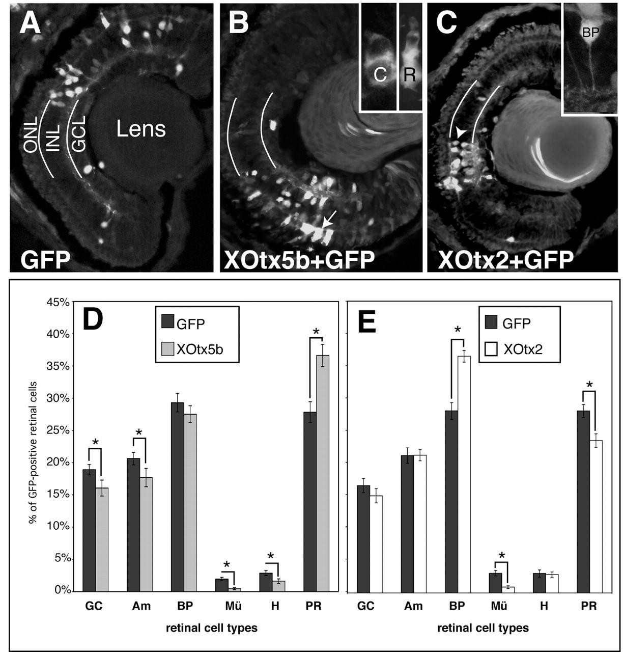 Fig. 4. Overexpression of XOtx5b or XOtx2 in developing Xenopus retinoblasts causes an increase in photoreceptors or bipolars, respectively. (A) Co-lipofection of GFP and the pCS2+ vector in the Xenopus retina. A diversity of retinal cell types express the fluorescent marker. White lines are drawn over the inner and outer plexiform layers to better define the outer nuclear layer (ONL), inner nuclear layer (INL) and the ganglion cell layer (GCL). (B) Retina co-lipofected with XOtx5b and GFP shows an increase in lipofected photoreceptor cells (arrow). The insets show a close-up of a cone (C) and a rod (R) photoreceptor cell. (C) Retina co-lipofected with XOtx2 and GFP shows an increase in the number of lipofected bipolar cells (arrowhead). (Inset) Confocal image of a representative bipolar cell (BP). (D,E) Each of the retinal cell types (GC, ganglion cells; Am, amacrine cells; BP, bipolar cells; Mü, Müller cells; H, horizontal cells; PR, photoreceptor cells) was counted per retina (n) and the percentage for each was determined. The graphs show an average of the percentages obtained. (D) GFP + pCS2+ (n=45) and XOtx5b + GFP (n=32) lipofected retinas. (E) GFP + pCS2+ (n=20) and XOtx2 + GFP (n=20) lipofected retinas. The error bars represent the s.e.m. The asterisks indicate significant difference by a Student's t-test between the ratios found for the control versus the experimental for that particular cell type with Pâ¤0.003.
