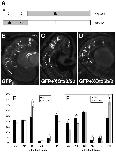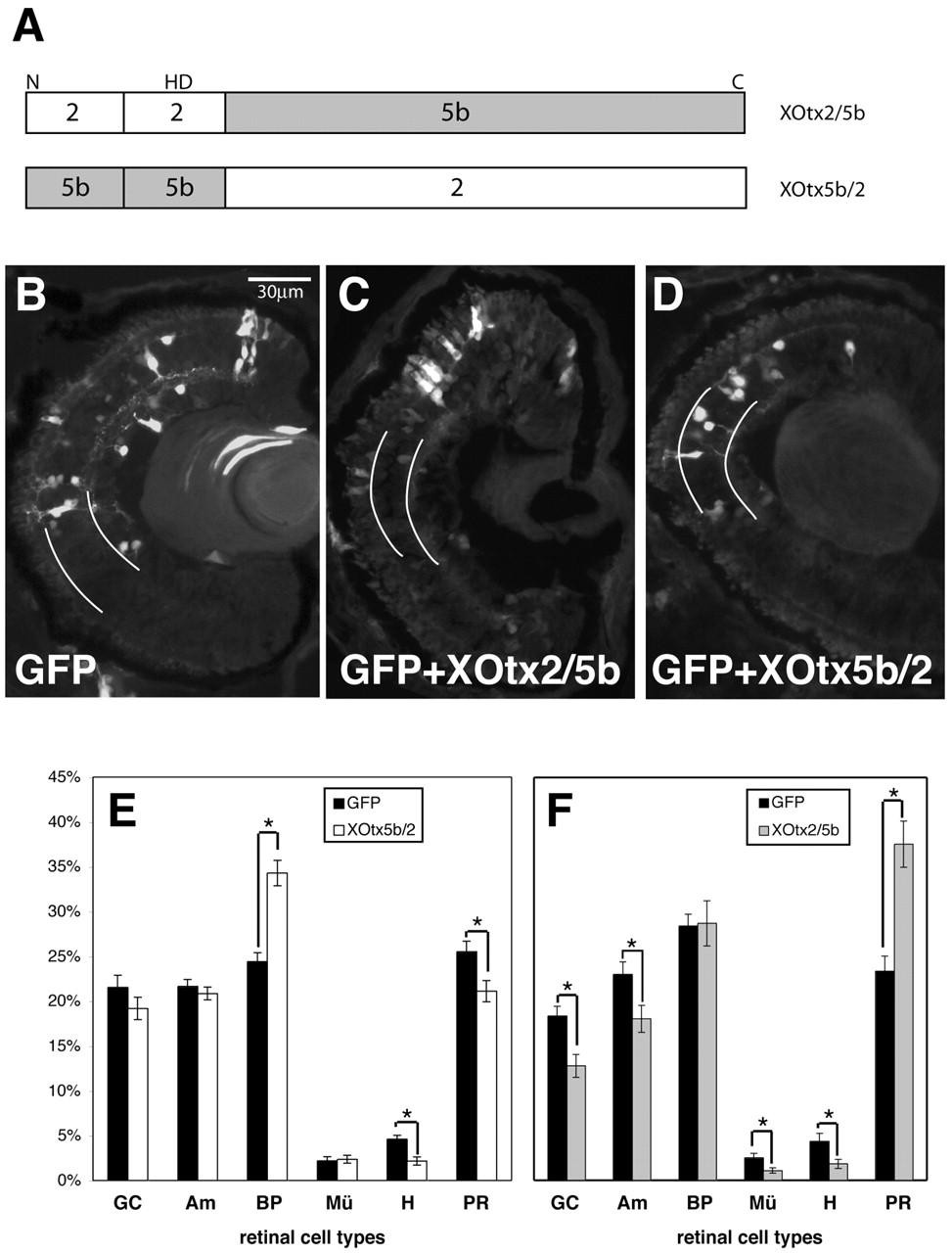 Fig. 6. Swapped domain experiments suggest that the C terminus of XOtx2 or XOtx5b is necessary in determining bipolar or photoreceptor cell fate, respectively. (A) Schematic of constructs used in lipofection experiments. N, N terminus; HD, homeodomain; C, C terminus; 2, XOtx2; 5b, XOtx5b. (B-D) Stage 41 lipofected retinas were sagittally cryostat sectioned (10 μm) after transfection with GFP and pCS2+ vector, XOtx2/5b or XOtx5b/2 during early stages of eye formation. Lines are drawn over inner and outer plexiform layers to define the laminated retina (see Fig. 4). (B) GFP lipofected retina shows all retinal cell types. (C) GFP and XOtx2/5b lipofected retinas have an increase of photoreceptor cells as do XOtx5b lipofected retinas. (D) GFP and XOtx5b/2 lipofected retinas also have an increase of bipolar cells. (E-F) Quantitative analysis of retinas lipofected with GFP and pCS2+ compared to retinas lipofected with (E) XOtx5b/2 and GFP (pCS2+, n=24; XOtx5b/2, n=30) or (F) GFP and XOtx2/5b (pCS2+, n=26; XOtx2/5b, n=23). The ratio of retinal cells per total retina was calculated for each retina and then the ratios averaged for the total retinas counted (n). The error bars, s.e.m.; Pâ¤0.05 (Student's t-test).