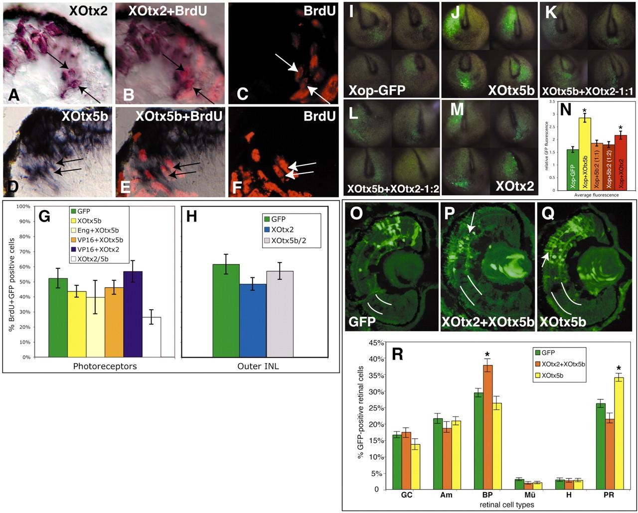 Fig. 7. XOtx2 and XOtx5b are expressed in proliferating cells but do not stimulate proliferation. (A-F) A close-up of stage 41 retinal cryostat sections (10 μm) showing the ciliary marginal zone of embryos injected with BrdU and fixed 30 minutes later. Arrows in A-C and D-F point to the same cells. (A) A section stained for XOtx2 RNA shows labelled cells (arrows). (C) This section is stained with a BrdU antibody and is viewed under fluorescence. (B) Merged images of A and C (50% transparency). The same experiment is shown for XOtx5b in D-F. (G-H) The total number GFP-positive and BrdU+GFP-positive retinal cells were counted in five retinas lipofected with GFP and the vector alone (n=403), XOtx5b (n=355), EngR+XOtx5b (XOtx5bN+HD-EngR; n=317), VP16+XOtx5b (XOtx5b-VP16; n=384), VP16+XOtx2 (XOtx2-VP16; n=322) and XOTx2/5b (n=353), XOtx2 (n=418), or XOtx5b/2 (n=413). The percentage of BrdU-positive cells was calculated. None of the constructs tested gave an increase in proliferation of photoreceptor cells (G) or cells found in the outer edge of the inner nuclear layer (H). This analysis was done using a Student's t-test. n=the total number of cells counted. (I-R) XOtx2 modulates XOtx5b activity. (I-M) Embryos at stage 18 visualised under fluorescent light that have been injected on one side with the Xenopus opsin promoter fused to (I) GFP (Xop) DNA, β-gal RNA (200 pg) and (J) 50 pg XOtx5b RNA (XOtx5b); (K) 25 pg XOtx5b and 25 pg XOtx2 (XOtx5b+XOtx2 1:1); (L) 17 pg XOtx5b and 33 pg XOtx2 (XOtx5b+XOtx2 1:2); (M) 50 pg XOtx2 (XOtx2). (N) Embryos from each set of injections [Xop (n=35); XOtx5b (n=37); XOtx5b+XOtx2 1:1 (n=28); XOtx5b+XOtx2 1:2 (n=29); XOtx2 (n=31)] were individually photographed under fluorescence and the fluorescence on both sides of the embryo was measured. The ratio of fluorescence on the injected versus uninjected side was calculated (relative GFP fluorescence) and an average for all the embryos from that set was made. Significant difference from the Xop-GFP control set using a Student's t-test was found for both the XOtx5b (P<0.001) and XOtx2 set (P<0.001). XOtx5b and XOtx2 together with Xop did not activate the Xop construct, suggesting that XOtx2 modulates the ability of XOtx5b to activate opsin. (O-Q) Sagittal section of stage 41 embryos lipofected with either GFP and pCS2+ vector (O), GFP, XOtx2 and XOtx5b (P), or GFP and XOtx5b (Q). Arrows point to an increase in bipolar cells in P and an increase in photoreceptors in Q. (R) Graph showing the percentage of GFP-positive retinal cells in retinas lipofected with GFP and the vector alone (n=1255); GFP, XOtx2 and XOtx5b (n=995); and GFP and XOtx5b (n=1188). Asterisks: P<0.01 as determined by a Student's t-test; n, number of GFP-positive retinal cells counted; GC, ganglion; Am, amacrine; BP, bipolar; Mü, Müller; H, horizontal, and PR, photoreceptor cells. Error bars represent s.e.m.