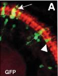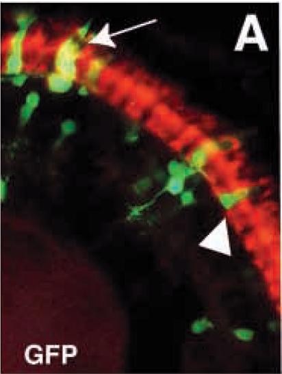 calb1 ( calbindin ) gene expression in Xenopus laevis embryo via in immunohistohemistry, NF stage 41. Cryostat sections (10 mm) of retinas lipofected with GFP and the pCS2+ vector then stained with an anti-cone photoreceptor antibody (calbindin in red). Arrowheads indicate cells that fluoresce with GFP alone (green) and arrows indicate cells expressing both GFP and calbindin (yellow).