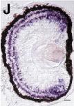 Fig. 2. Expression of XOtx5b and XOtx2 in retinal sections. Section in situ hybridisation of XOtx2 (A-E) and XOtx5b (F-J) in the Xenopus retina at stages 25/26 (A,F), 28 (B,G), 33 (C,H), 37 (D,I) and 41 (E,J). (A,F) XOtx2 (A) is expressed throughout the presumptive retinal pigment epithelium and retina while XOtx5b (F) expression is only in the central retina. (B,G) As retinal invagination progresses, expression of both XOtx2 (B) and XOtx5b (G) appear in the central retina. (C,H) Expression of XOtx2 (C) and XOtx5b (H) is identical. Transcripts from either of these genes are found throughout the developing retina except in the peripheral dorsal and ventral regions. (D,I) The central retinal expression of these two transcripts is reduced to particular layers. XOtx2 (D) is expressed in the outer edge of the inner nuclear layer (INL). XOtx5b (I) is also found in the outer edge of the INL and also in the outer nuclear layer (ONL). The peripheral retina still expresses these transcripts in the ganglion cell layer. (E,J) When the retina is mature, XOtx5b (J) is found in both the photoreceptor layer and the outer cells of the INL. Like XOtx2 (E), it is also found in the edge of the CMZ. XOtx2 is also expressed in cells at the outer edge of the INL. Bars: 20 μm; dashed lines indicate the extent of developing neural retina in A-D,F-I.