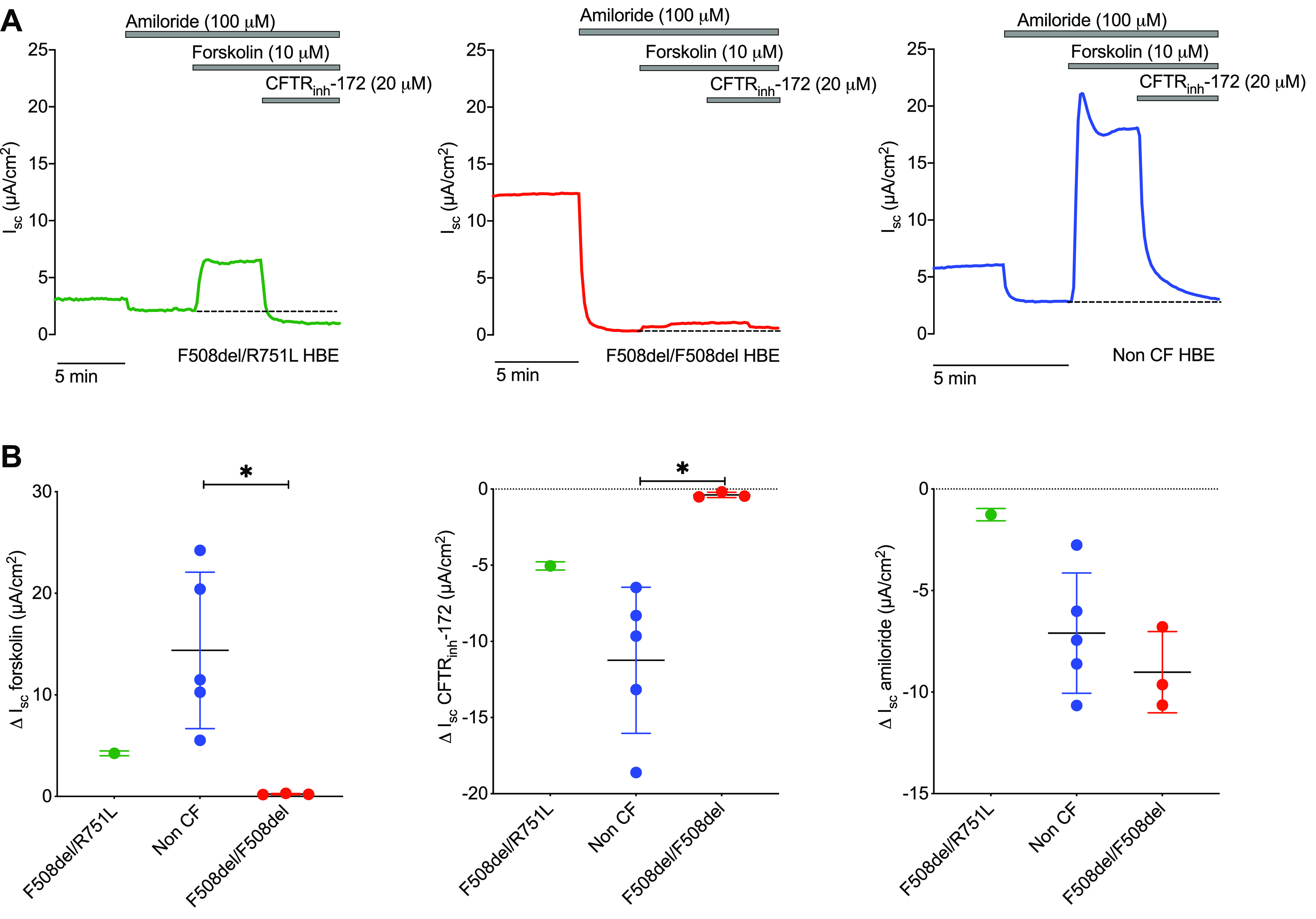 Figure 1. Short-circuit current responses in F508del/R751L, non-cystic fibrosis (CF), and F508del/F508del human bronchial epithelial (HBE) cultures. A: short-circuit current (Isc) responses to amiloride (100 µM), forskolin (10 µM), and CF transmembrane conductance regulator (CFTR)inh-172 (20 µM) were measured using Ussing chamber experiments in F508del/R751L, non-CF, and F508del/F508del HBEs. Representative traces shown from n = 1 donor in each graph. Lines indicate reagent addition to the apical Ussing chamber, which remained present in solution throughout the recordings. Functional CFTR is represented by a positive Isc deflection arising from net anion basolateral-apical secretion following forskolin addition. Dashed line indicates the baseline Isc prior to forskolin addition. CFTR is inhibited by the addition of CFTRinh-172. Amiloride addition inhibits epithelial sodium channel (ENaC)-mediated sodium absorption, resulting in a downward Isc deflection. B: comparative assessment of Isc showed greater responses to forskolin and CFTRinh-172 in non-CF compared with F508del/R751L HBEs. F508del/R751L HBEs demonstrated the smallest response to amiloride. Data are presented as mean (SD) responses for each donor and analyzed using unpaired t test. F508del/R751L HBEs were not included in statistical comparisons; n = 1 F508del/R751L donor, n = 5 non-CF donors, and n = 3 F508del/F508del donors for each graph. Minimum 3 culture inserts used from each donor. *P < 0.05.