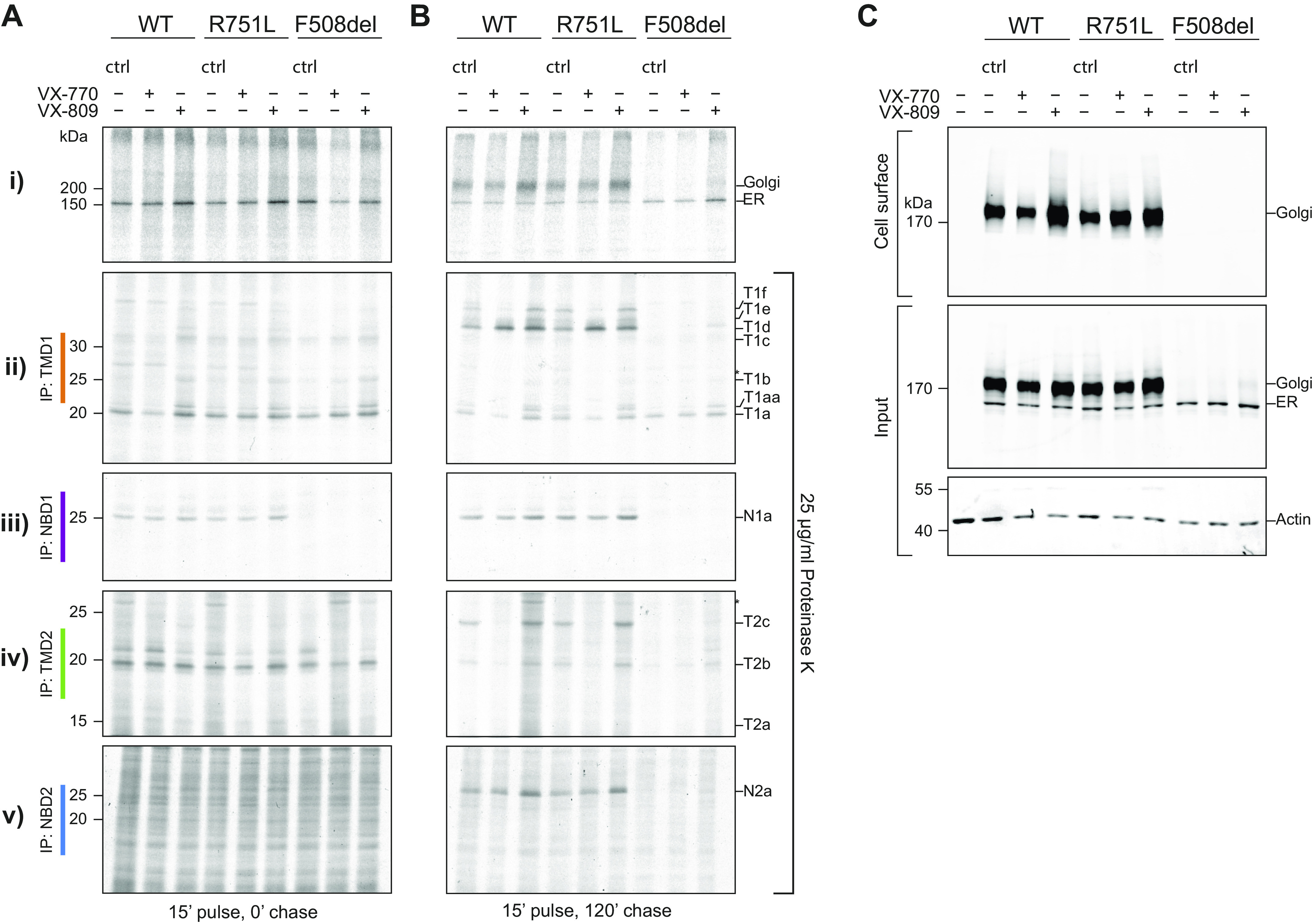 Figure 3. Impact of R751L on cystic fibrosis transmembrane conductance regulator (CFTR) protein folding and transport and cell surface expression. A and B: i) human embryonic kidney 293 (HEK-293) cells expressing wild-type (WT), R751L, and F508del CFTR constructs were labeled with 35S-methionine/cysteine for 15 min and chased for 0 (0′; A) and 2 h (120′; B) in the presence of VX-770 (3 µM), VX-809 (3 µM), or DMSO control (ctrl). Cells were lysed in 1% Triton X-100, and lysates were treated or not with proteinase K (25 µg/mL) for 15 min. CFTR and fragments were immunoprecipitated using TMD1C (TMD1; ii), Mr. Pink (NBD1 and full-length CFTR; iii), TMD2C (TMD2; iv), or 596 (NBD2) antibodies (v). *Nonspecific bands. N1a, protease-resistant NBD1-specific fragment; N2a, protease-resistant NBD2-specific fragment; T1d-f, protease-resistant TMD1-specific fragments; T2c, protease-resistant TMD2-specific fragment. T1, T2, and N2 fragments represent domain assembly, which is a late-folding stage of CFTR. C: cell surface biotinylation was performed in HEK-293 cells expressing CFTR constructs in the presence of VX-809, VX-770, or DMSO ctrl pretreatment. Cells were lysed in 1% Triton X-100, and lysates were used for pulldown of biotinylated proteins with Neutravidin beads. Proteins were analyzed on 7.5% SDS-PAA gels and transferred to PVDF membrane and blotted for CFTR (596) or actin. R751L was similar to WT-CFTR in transport to the Golgi (120′ chase), protein folding (protease resistance) of all 4 domains at both time points, and presence at the cell surface. Quantification for this data from 4 independent experiments is shown in Fig. 4.